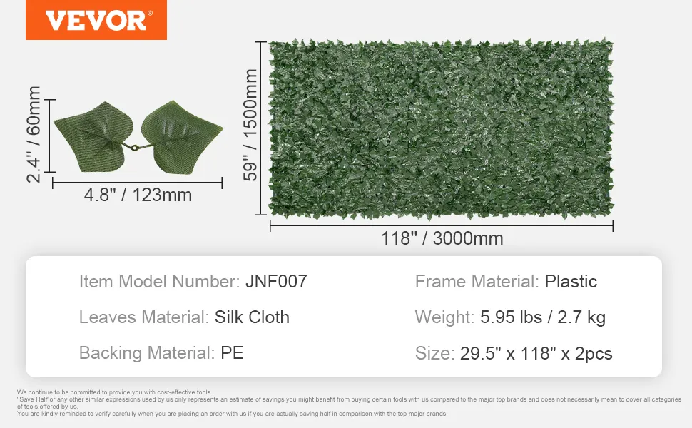 La recinzione per la privacy in edera VEVOR utilizza materiali di prima qualità. Il tessuto di seta crea le foglie, conferendo loro un aspetto realistico e durevole. Il PE di alta qualità garantisce un uso duraturo per il supporto. Il telaio in plastica ha una struttura robusta che dura per molti anni. Questa recinzione può resistere a pioggia, vento e sole senza perdere la sua bellezza. Con la sua qualità premium, ottieni una soluzione affidabile per la privacy. Non dovrai sostituirla tanto presto. È un investimento eccellente per il tuo spazio esterno.