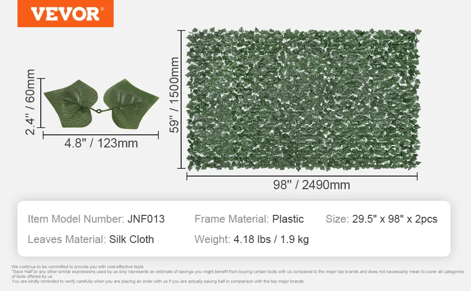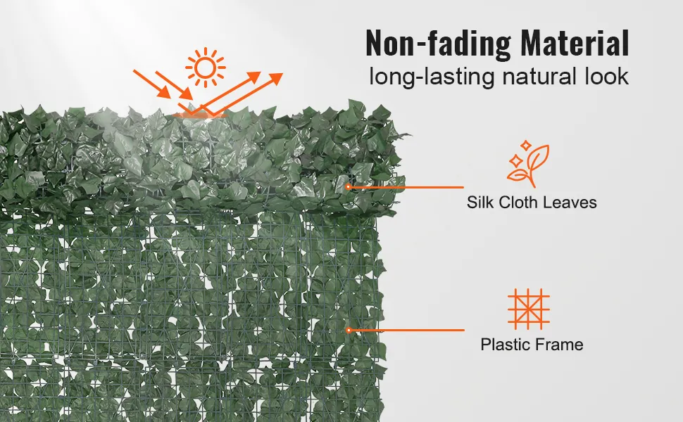 La recinzione per la privacy in edera VEVOR è costruita per durare. È realizzata con materiali durevoli che possono resistere a varie condizioni atmosferiche. Il tessuto di seta conferisce alle foglie un aspetto naturale mantenendone la resilienza. I telai in plastica offrono resistenza e stabilità. Ciò garantisce che la recinzione rimanga intatta anche in condizioni meteorologiche avverse. Può essere utilizzata a lungo termine in giardini, cortili e balconi. Resiste anche allo sbiadimento e all'usura, mantenendo la sua bellezza nel tempo. Di conseguenza, è una soluzione incredibilmente conveniente per le esigenze di privacy. Pertanto, puoi fidarti di questa recinzione per fornire privacy duratura e fascino estetico in qualsiasi ambiente esterno.