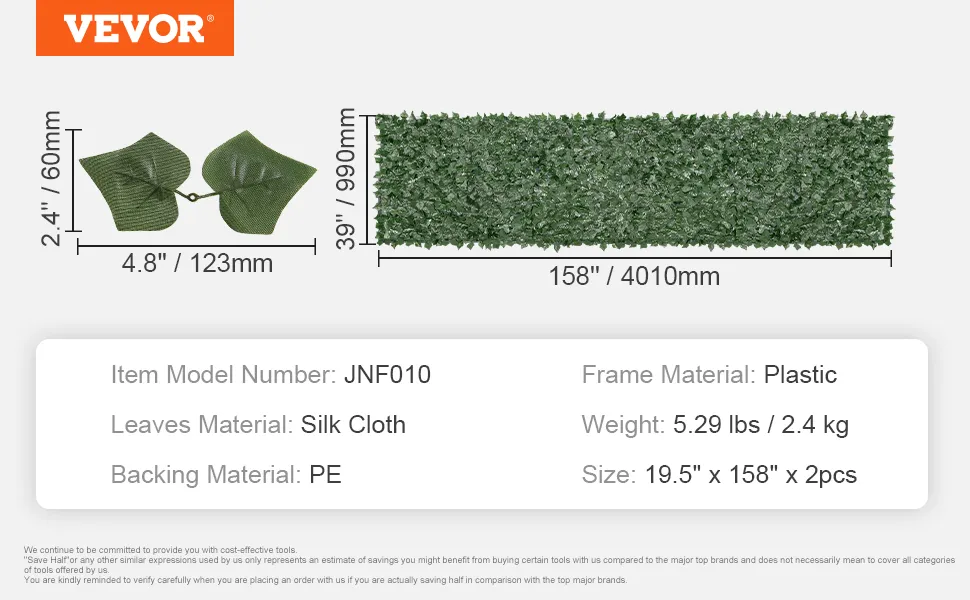 La recinzione per la privacy in edera VEVOR presenta siepi finte realistiche. Queste foglie artificiali sembrano molto naturali. Aggiungono un tocco di verde a qualsiasi spazio. Il materiale in tessuto di seta conferisce un aspetto reale. Da lontano, è difficile sapere che non è reale. Ciò aumenta l'attrattiva estetica di qualsiasi area. Le foglie verdi sono vivaci e accattivanti. Crea un'atmosfera attraente. La recinzione trasforma spazi noiosi in splendidi rifugi nella natura. Vita e colore negli ambienti esterni. È un modo meraviglioso per portare colore e vita a qualsiasi ambiente esterno. L'aspetto naturale delle foglie di edera la fa risaltare. Essendo sia funzionale che decorativa, è un'eccellente aggiunta a qualsiasi spazio.