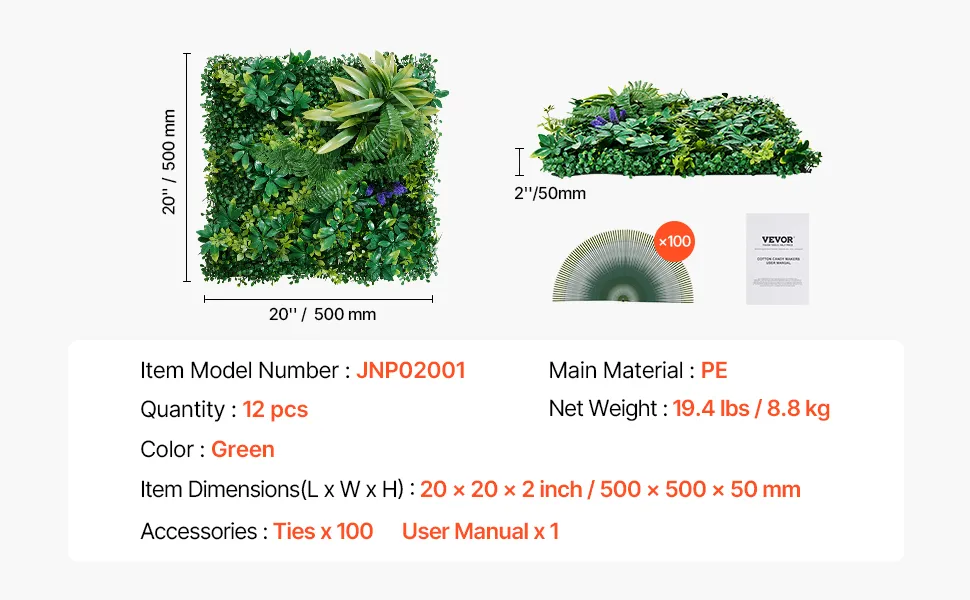 Area di copertura di 33 piedi quadrati: ogni set di parete di vegetazione sintetica include 12 pannelli, che coprono fino a 33 piedi quadrati. Prima dell'acquisto, puoi misurare lo spazio e determinare la quantità appropriata necessaria per ottenere la copertura desiderata