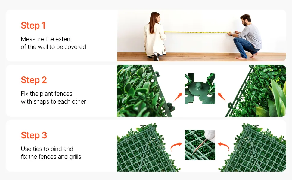 Realizzata in materiale PE denso e dall'aspetto naturale, questa parete vegetale artificiale è facile da assemblare utilizzando semplici connettori ad incastro. Includiamo anche fascette per garantire un fissaggio sicuro.