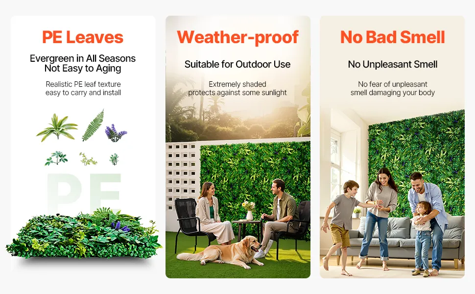 Realizzata in PE di alta qualità, la parete vegetale offre un aspetto realistico quasi identico alle piante vere. La sua maggiore durevolezza ed è priva di odori sgradevoli, assicurando un ambiente confortevole per te e la tua famiglia.