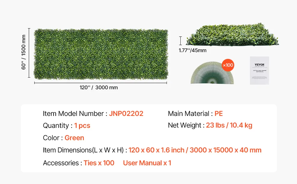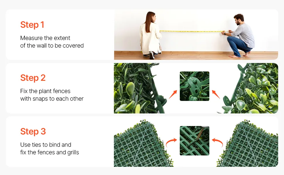 Installazione rapida e semplice: il sistema a scatto ad incastro consente un assemblaggio rapido e sicuro della parete vegetale. Inoltre, forniamo 100 fascette omaggio per fissare saldamente i pannelli alle recinzioni o ad altre superfici