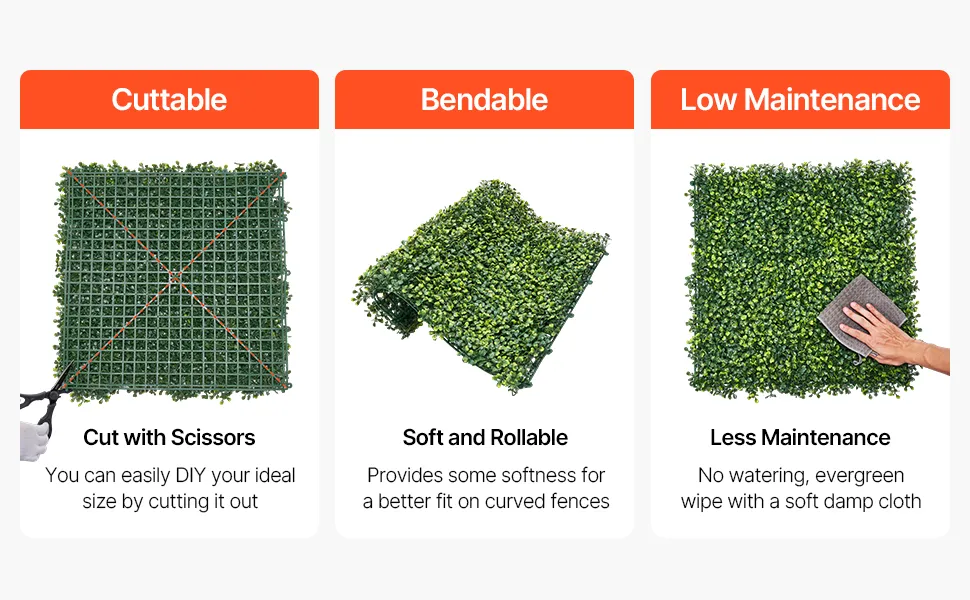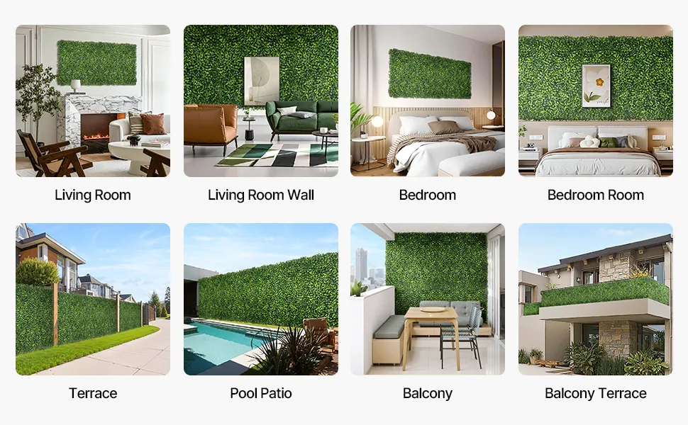 Versatile per molteplici scenari: adatta sia per spazi interni che esterni, questa parete vegetale può decorare balconi, patii, giardini o pareti interne senza sforzo. È anche perfetta per decorazioni natalizie, valorizzando facilmente sfondi stagionali o spazi per eventi