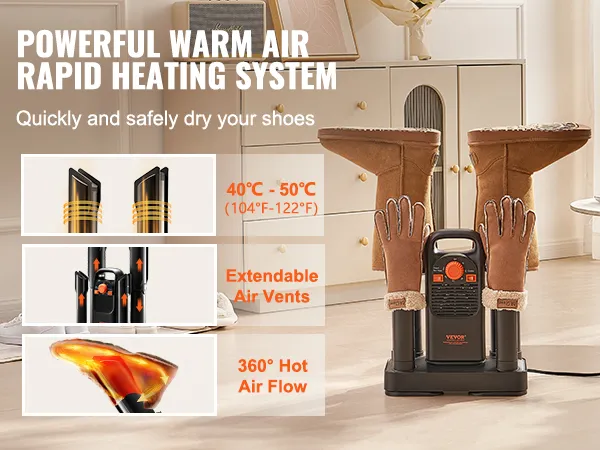 Asciugatura rapida in 1-3 ore: il nostro asciuga scarpe è dotato di quattro tubi e può asciugare 2 paia di scarpe contemporaneamente, migliorando l'efficienza. Il potente sistema di asciugatura ad aria calda forma rapidamente un flusso circolare di aria calda quando riscaldato.