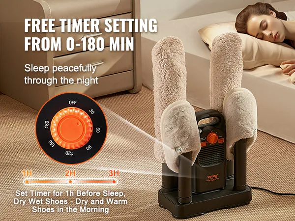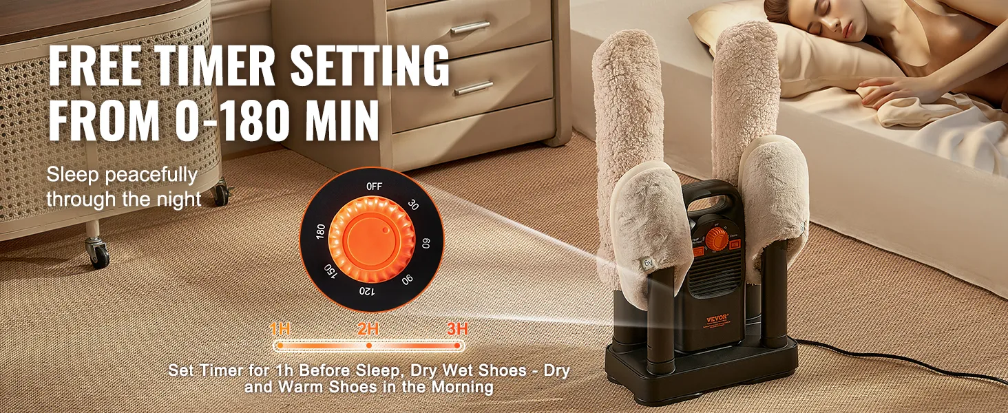Questo asciuga scarponi include una funzione timer regolabile di 3 ore, eliminando la necessità di rimanere svegli ad aspettare che le scarpe si asciughino. Si spegne automaticamente una volta completato il ciclo di asciugatura, assicurandoti tranquillità mentre dormi.