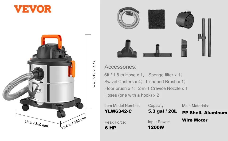 VEVOR Aspiraliquidi da officina 20 L, Aspiraliquidi Portatile in Acciaio Inossidabile, 6 HP Max, Aspirazione Efficiente con Bocchetta, Ruote, per Tappeti, Detriti, Peli di Animali, Nero Argento