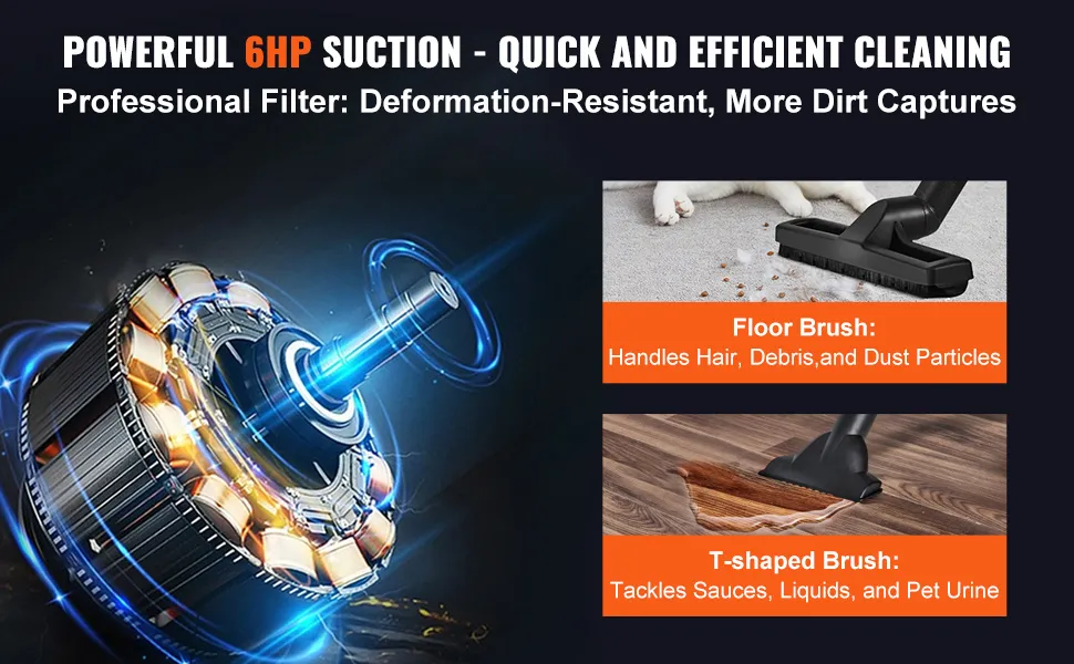 I filtri professionali e resistenti alla deformazione facilitano l'aspirazione di più sporco. Dotato di una spazzola per pavimenti e una spazzola a T per trattare ampie aree di peli, detriti e particelle di polvere.