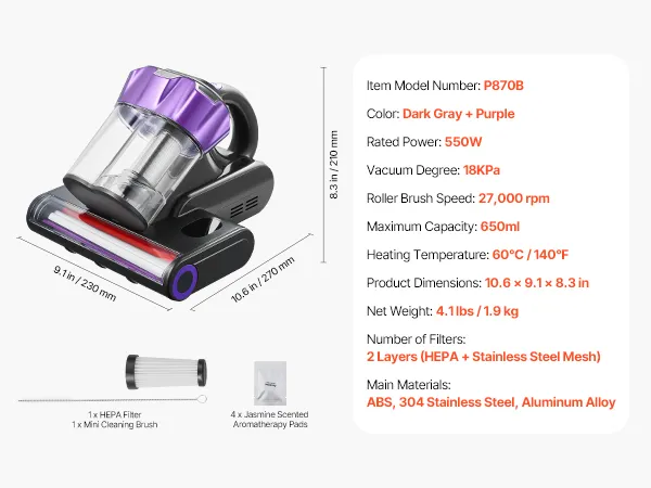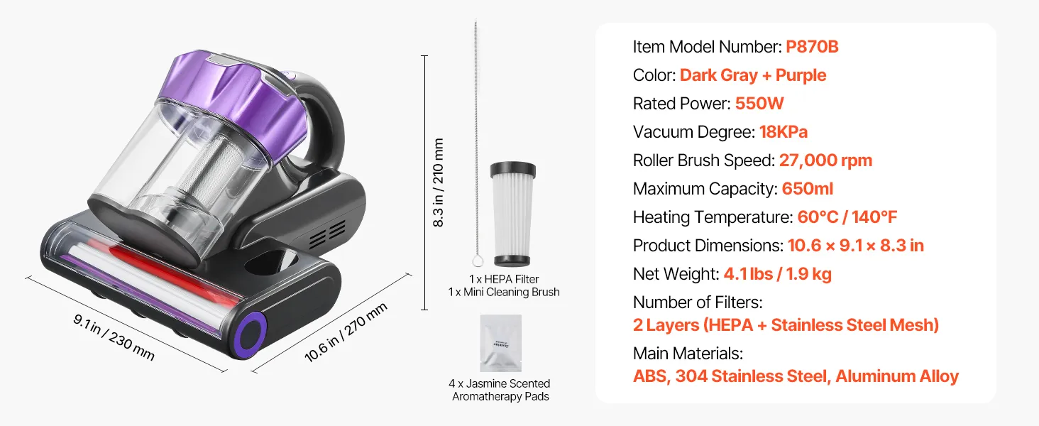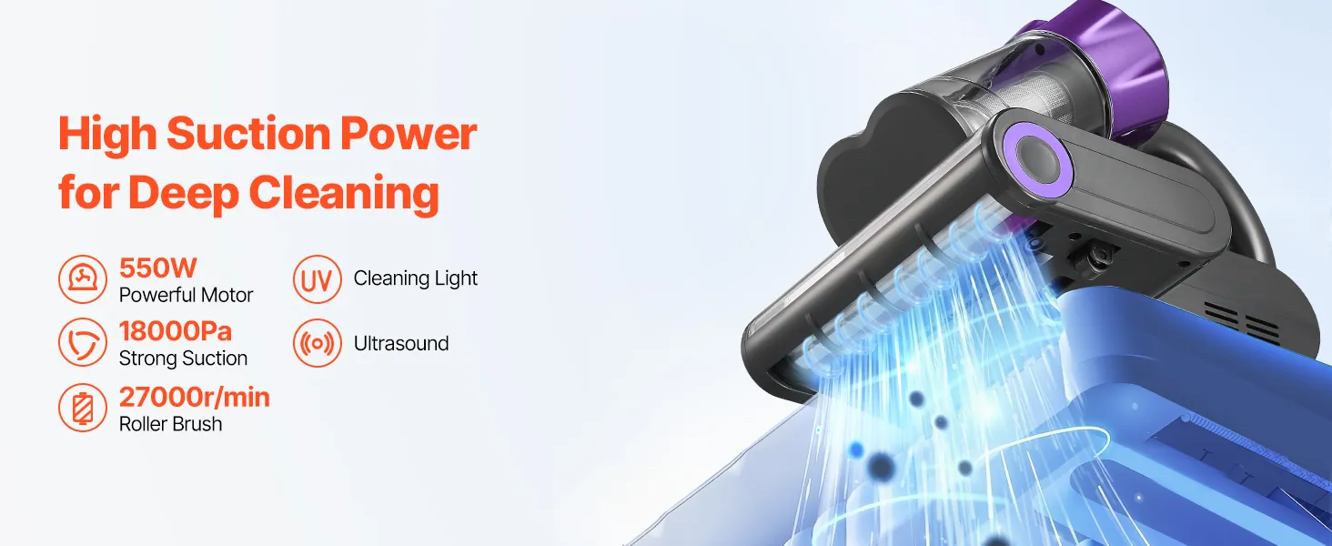 Aspirazione potente: con un motore da 550 W, questo aspirapolvere per materassi fornisce un'aspirazione di 18 Kpa e una spazzola a rullo ad alta velocità che gira a 27.000 giri al minuto, rimuovendo senza sforzo peli, polvere e scaglie di pelle da materassi e divani