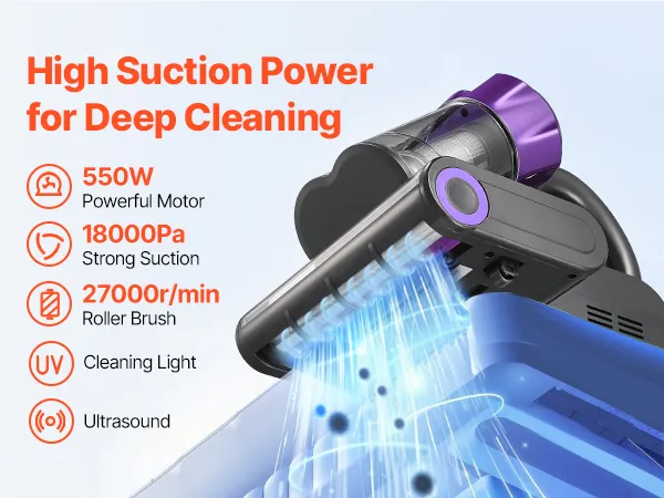 Con una potenza di aspirazione fino a 18 Kpa e una spazzola rotante ad alta velocità da 27.000 giri al minuto, è dotato di luce pulente e tecnologia a ultrasuoni per penetrare rapidamente nei tessuti e rimuovere la polvere.