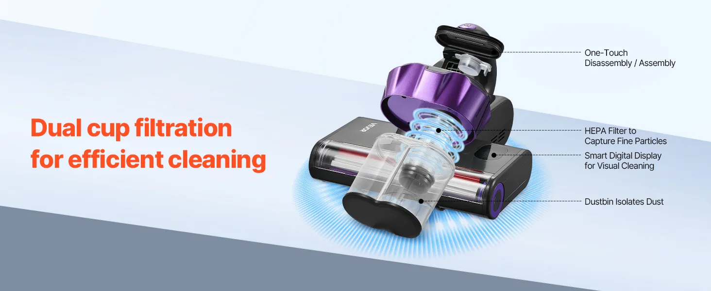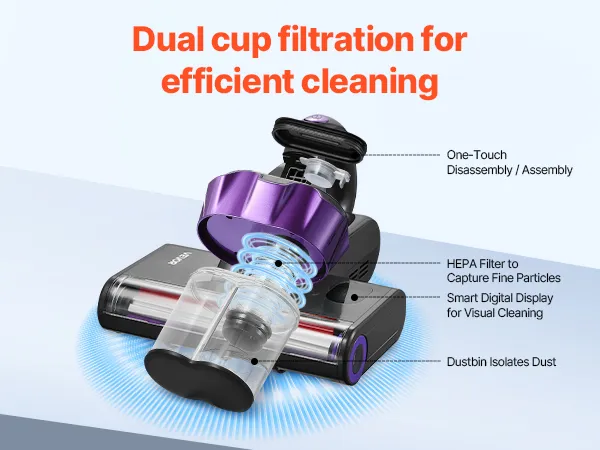 Doppia filtrazione: il filtro HEPA cattura le particelle minuscole mentre il contenitore della polvere di grande capacità da 650 ml separa le particelle di polvere più grandi. Il lato sinistro filtra e il lato destro raccoglie la polvere