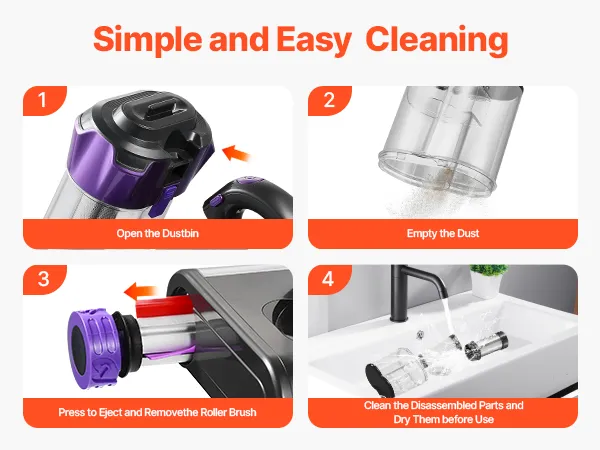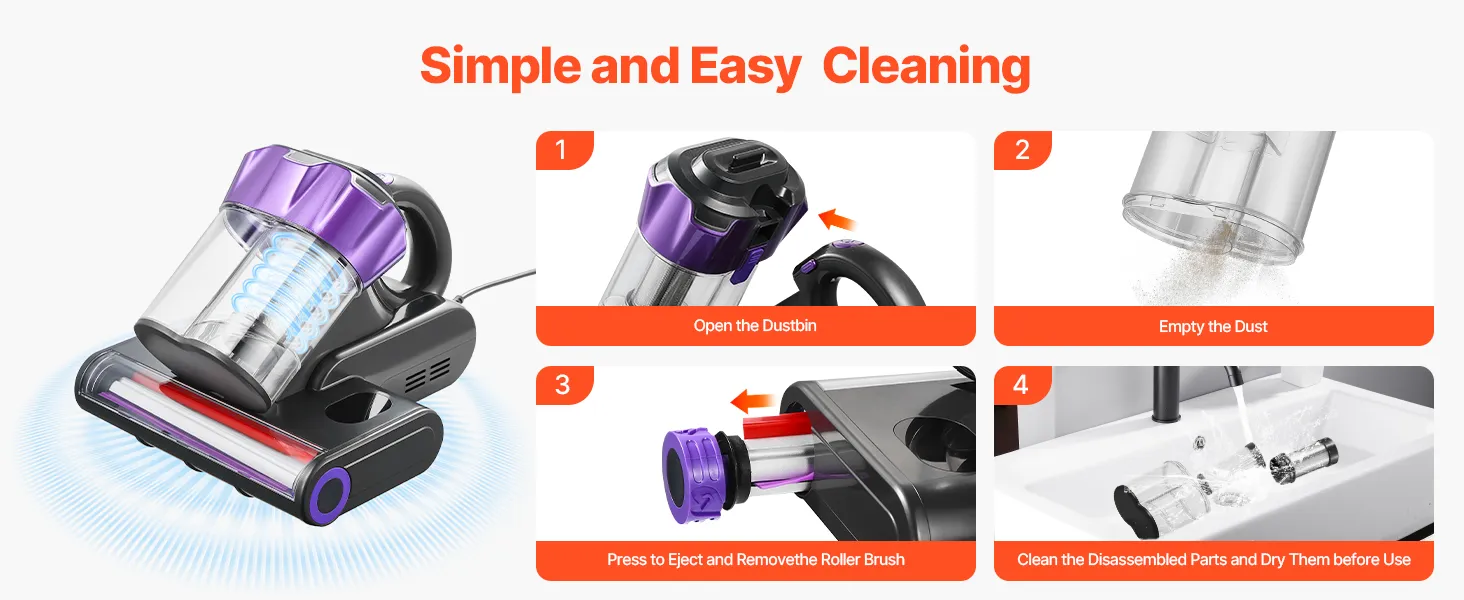 Il filtro HEPA, il contenitore della polvere e la spazzola a rullo sono tutti staccabili e lavabili per una facile manutenzione. Assicurati di pulire accuratamente dopo l'uso e assicurati che tutte le parti siano asciutte prima di riutilizzarle.