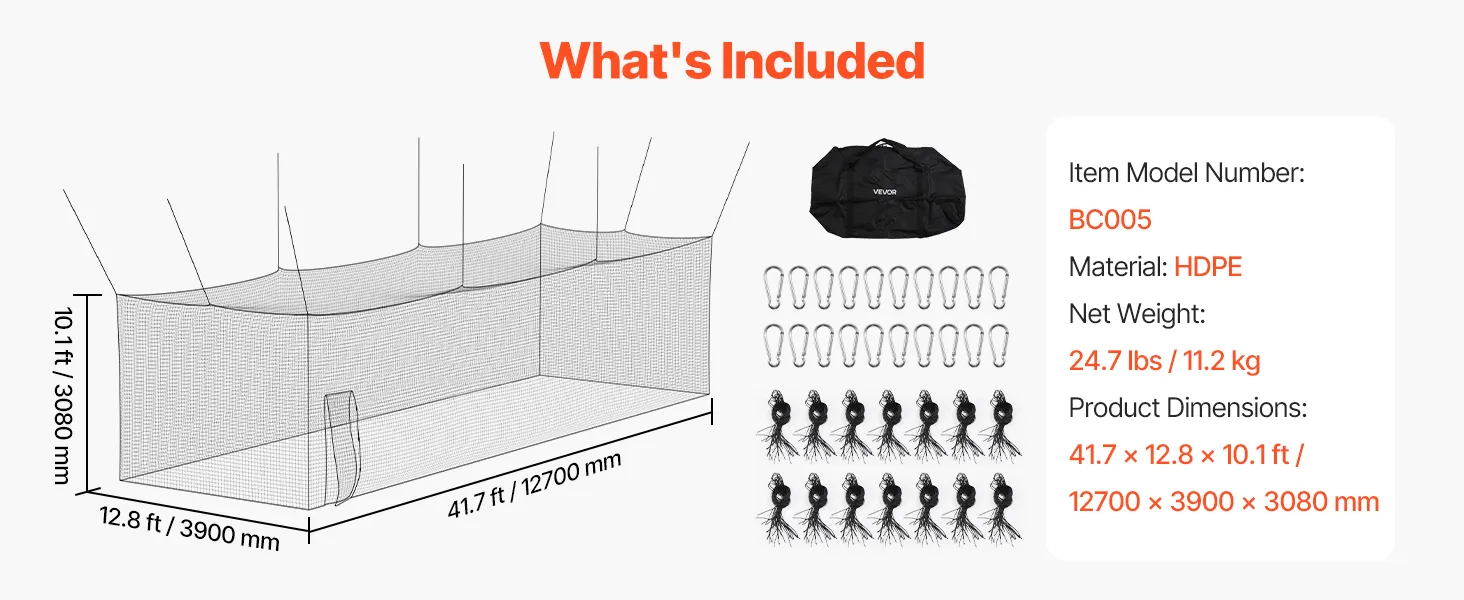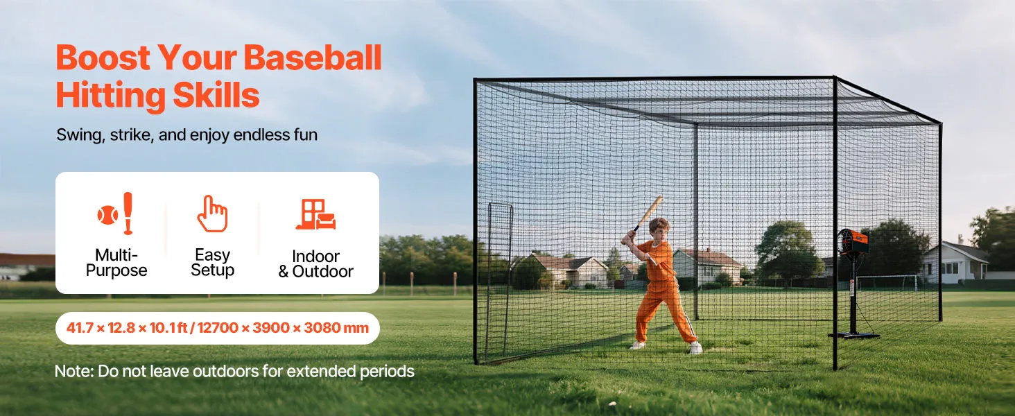 Spaziosa gabbia di allenamento: la nostra rete per gabbia da battuta (solo rete) misura 12700 x 3900 x 3080 mm, offrendo uno spazio di allenamento dedicato ad atleti e allenatori. Completamente chiusa per impedire alle palline di volare via