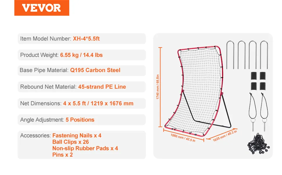 VEVOR Rete da Rimbalzo per Baseball Softball, Rete di Lancio per Baseball PitchBack, Rete da Rimbalzo 1219 x 1676 mm per Allenatore da Campo con Bersaglio di Lancio, Rete da Rimbalzo per Allenamento