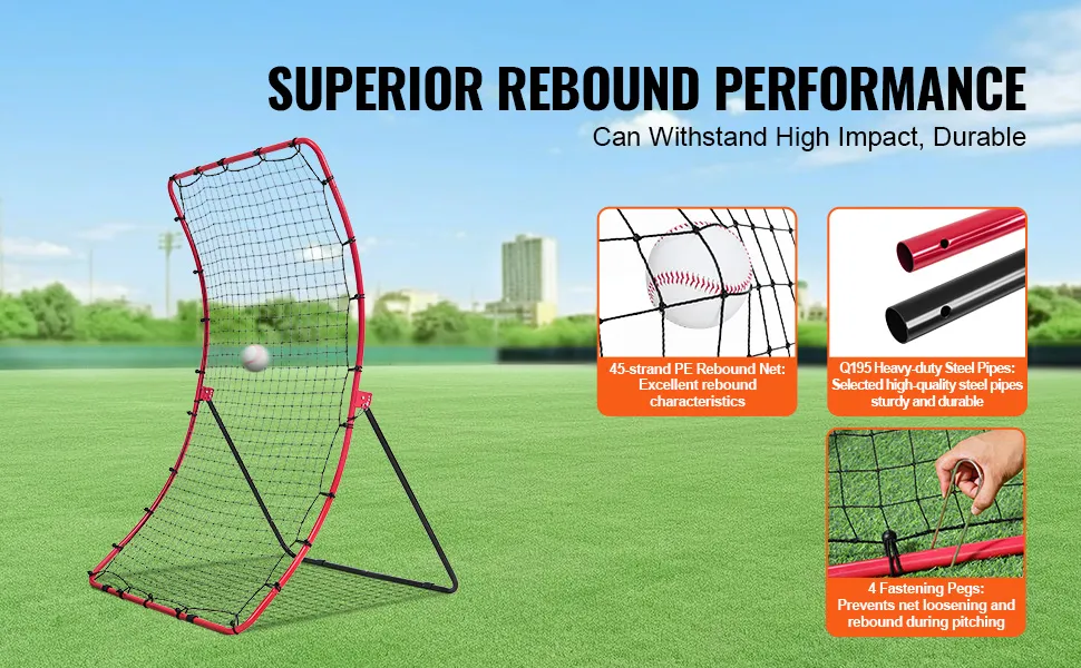 Design della rete curva: una rete da rimbalzo da baseball da 4 x 5,5 piedi (1219 x 1676 mm) con un design della rete curva che fornisce diversi angoli di rimbalzo in aree diverse per aumentare la casualità dei ritorni della palla. Progettato per baseball e softball, adatto a principianti, professionisti e giocatori ricreativi.