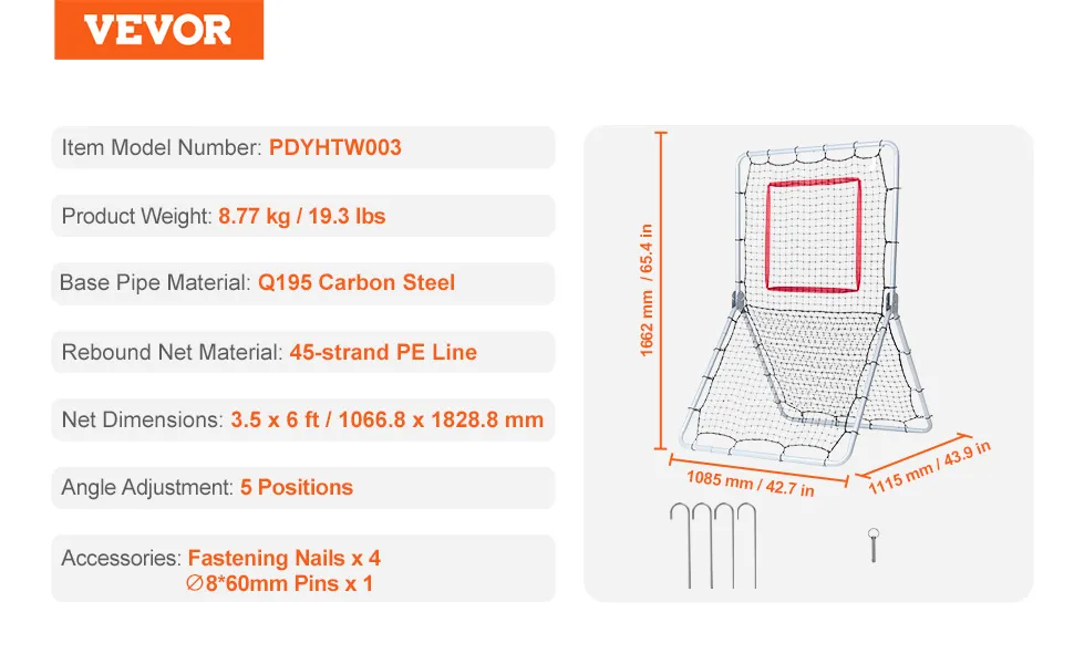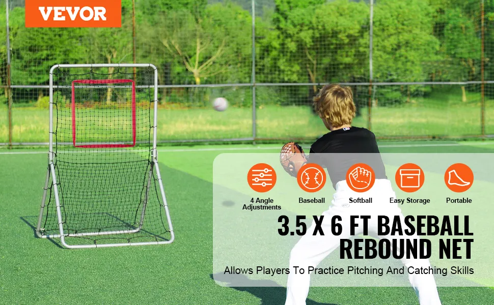 VEVOR Rete da Rimbalzo per Softball da Baseball, Rete da Lancio da Baseball 1066,8 x 1828,8 mm, Rete Battute per Allenatore Rimbalzo per Lanciatori, 5 Angoli Regolabili, per Pratica di Campo Lancio