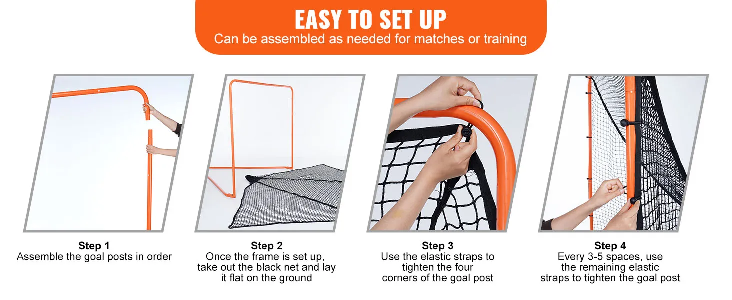 L'installazione di questa porta da lacrosse è semplice, grazie al suo sistema di bloccaggio a scatto. La sua struttura in acciaio si collega saldamente e le 50 corde elastiche assicurano che la rete si attacchi saldamente e rimanga in posizione durante l'uso. Progettata per essere facile da montare, è un'eccellente scelta per i principianti o per chiunque apprezzi i tempi di installazione rapidi. Questa caratteristica la rende una rete da lacrosse con struttura in acciaio ideale per coloro che desiderano un'esperienza fluida durante l'allenamento di lacrosse in giardino.