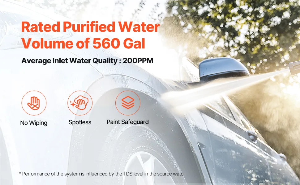 Il sistema di lavaggio auto funziona in modo efficiente con un'erogazione di acqua stabile, con una capacità nominale di 560 galloni. Fornisce acqua pura deionizzata per un'esperienza di lavaggio auto impeccabile e senza aloni, riducendo al minimo la necessità di pulire.