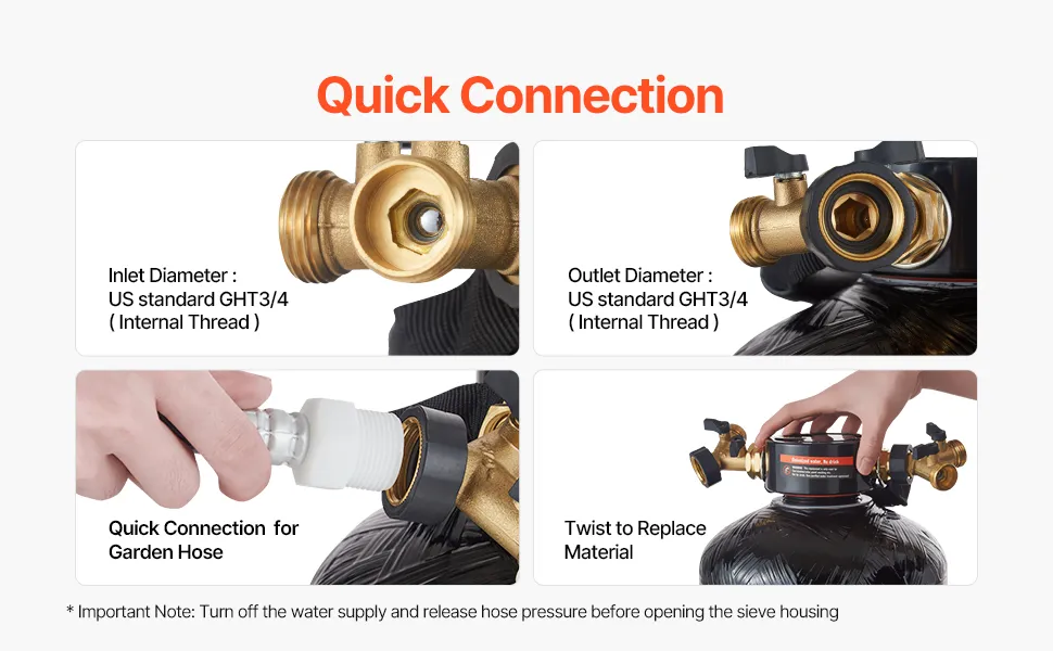 Il dispositivo di lavaggio auto deionizzato e antimacchia ha dimensioni di ingresso e uscita standard, che hanno un collegamento rapido con un tubo da giardino. Devi solo semplicemente ruotare il serbatoio per aprire e sostituire facilmente il filtro.