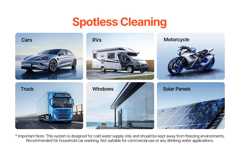 Il sistema di lavaggio auto viene utilizzato principalmente per la pulizia quotidiana di auto e camper, ma può essere utilizzato anche per pulire barche, motociclette, finestre, pannelli solari, ecc., ottenendo una superficie lucida e priva di incrostazioni di calcare.