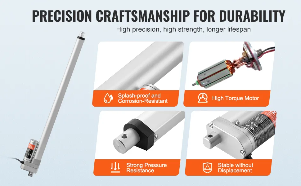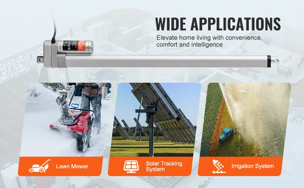 L'attuatore lineare VEVOR da 12 V è la scelta migliore per l'inseguimento solare. È adatto per sistemi di irrigazione e automazione di mobili, il che lo rende ideale per applicazioni all'aperto. Grazie al suo design impermeabile, può gestire l'umidità e l'elevata umidità, il che lo rende una scelta affidabile per queste attività. Che tu stia inseguendo pannelli solari o automatizzando mobili, i nostri attuatori lineari da 12 V sono versatili e durevoli, il che li rende adatti a queste applicazioni. Puoi fidarti che funzioneranno bene in diverse impostazioni, specificamente progettati per soddisfare queste esigenze.