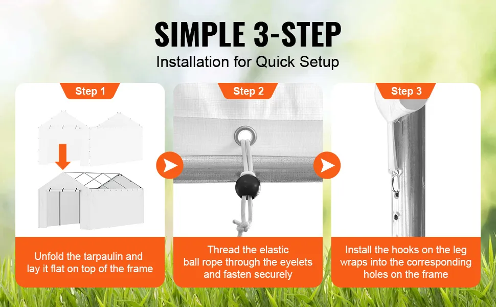Installazione semplice: viene fornito con elastici a sfera per il fissaggio tramite occhielli in alluminio, rendendo l'installazione semplice e senza attrezzi. N.B. La copertura della pensilina non è adatta al telaio a forma di arco.