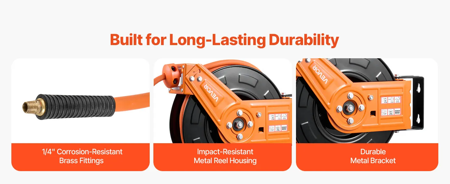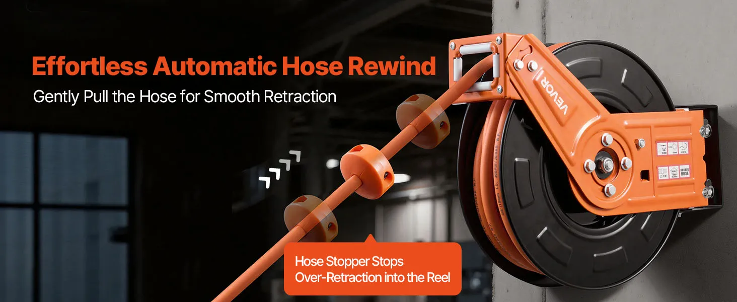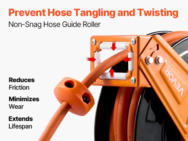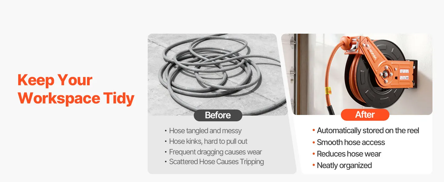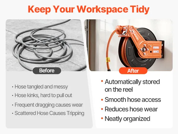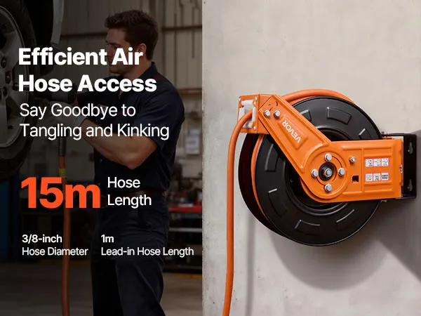 Niente più tubi aggrovigliati: l'avvolgitubo retrattile VEVOR include un tubo in gomma da 15 m x 9,5 mm e un tubo di alimentazione da 1 m per mantenere l'area di lavoro ordinata e senza grovigli. Niente più tubi che strisciano sul pavimento