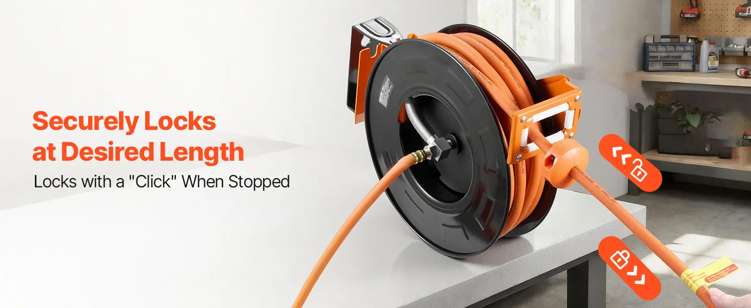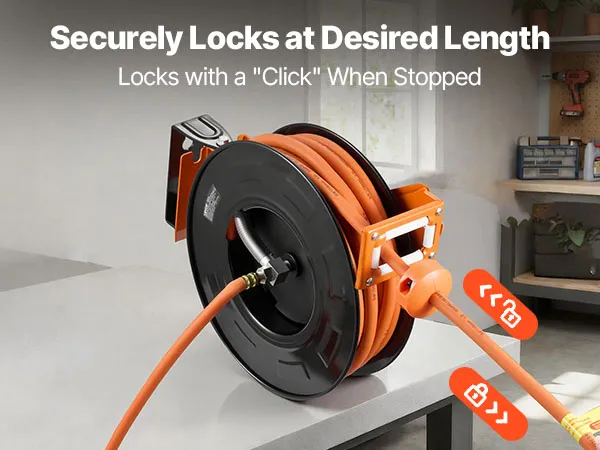 Il nostro avvolgitubo per aria compressa con riavvolgimento automatico è dotato di un meccanismo di bloccaggio integrato che consente di regolare facilmente la lunghezza del tubo e di bloccarlo saldamente nella posizione desiderata.