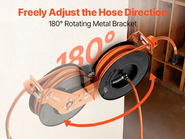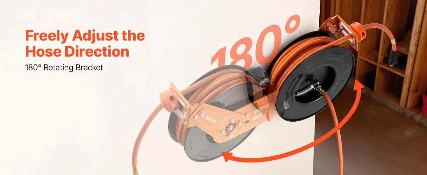 Staffa girevole a 180°: il nostro avvolgitubo per compressore d'aria è dotato di una staffa girevole a 180° per utilizzo più flessibile in più direzioni. Può essere montato su soffitti, pareti, mantenendo il tubo flessibile a portata di mano