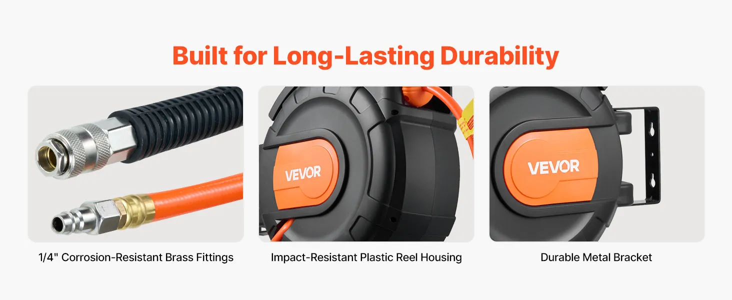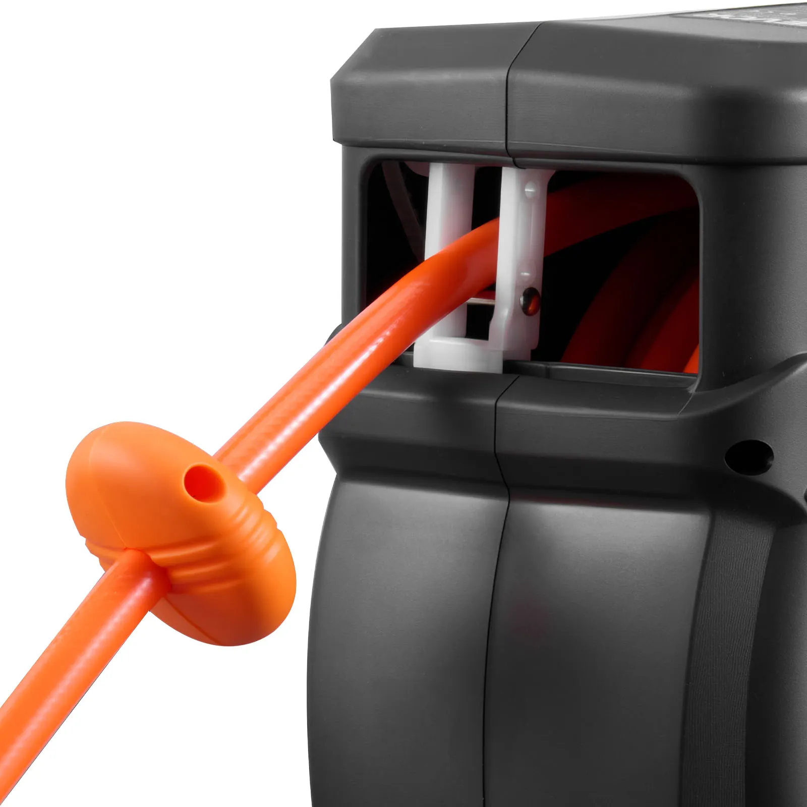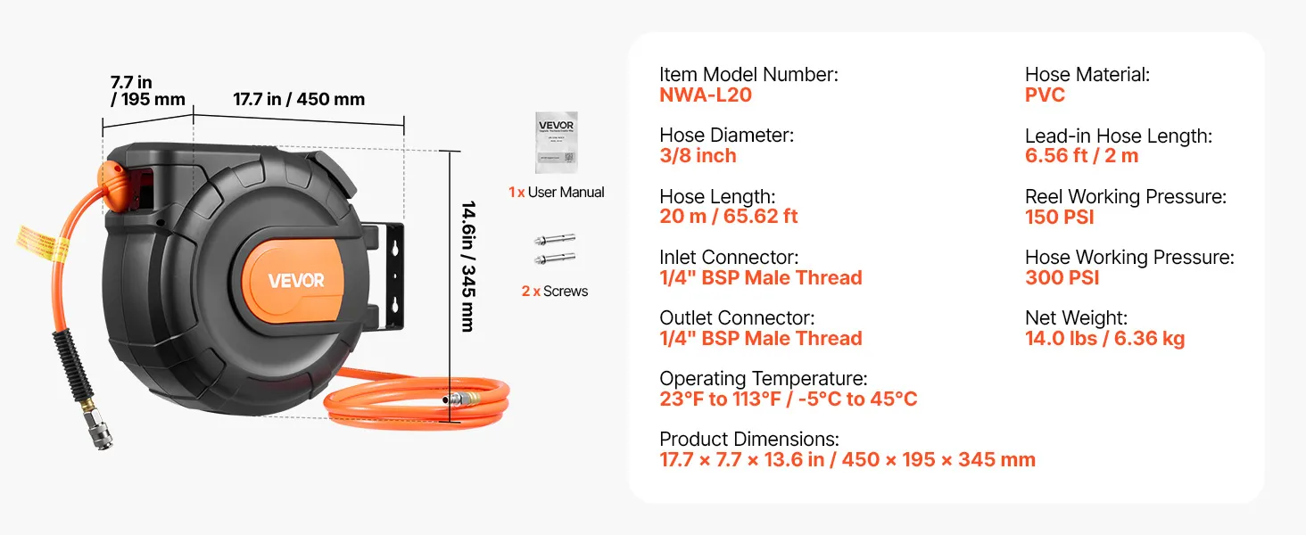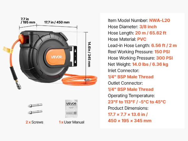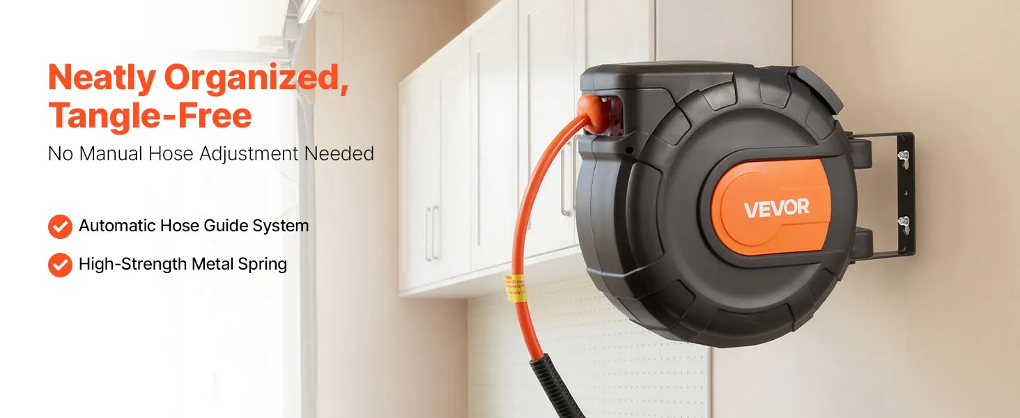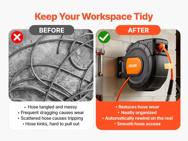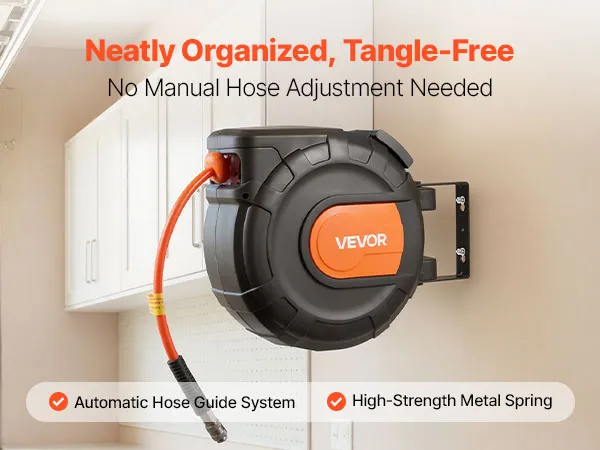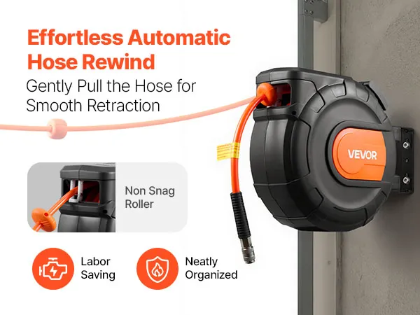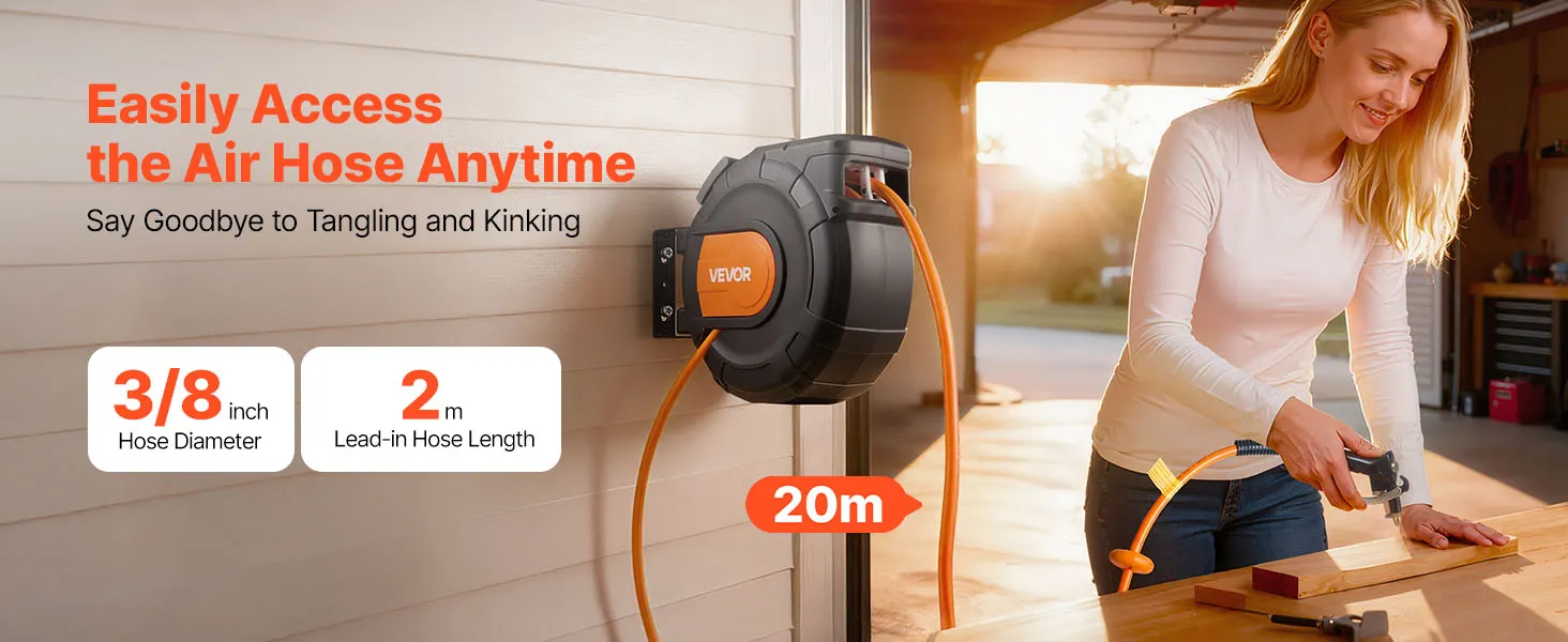 Niente più tubi aggrovigliati: l'avvolgitubo retrattile include un tubo flessibile in PVC da 20 m x 9,5 mm e un tubo di alimentazione da 2 m per mantenere l'area di lavoro ordinata e senza grovigli. Niente più tubi che strisciano sul pavimento