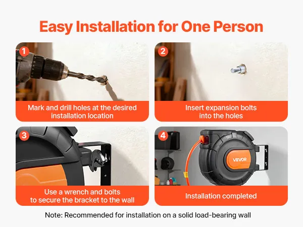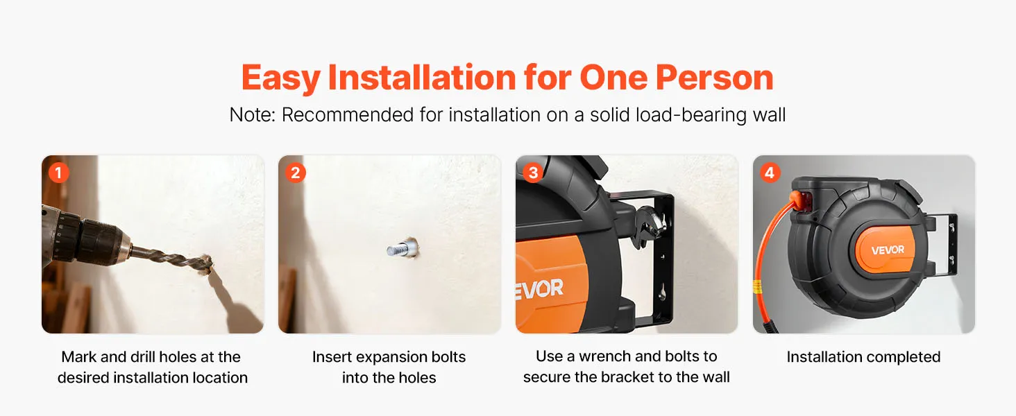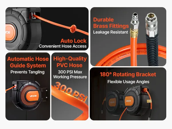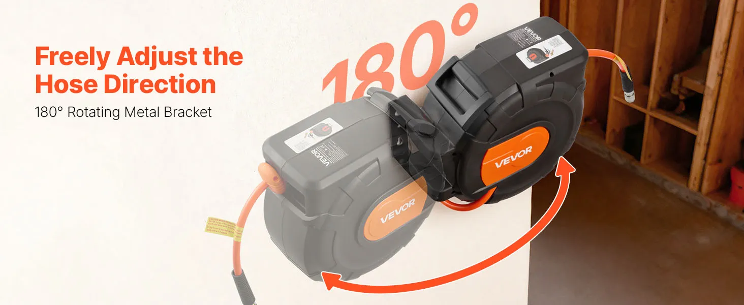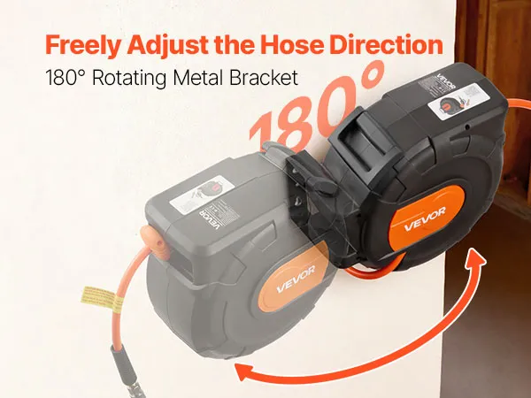 Staffa girevole a 180°: il avvolgitubo per compressore d'aria è dotato di una staffa girevole a 180° per utilizzo più flessibile in più direzioni. Può essere montato su soffitti, pareti o pavimenti, mantenendo il tubo flessibile a portata di mano