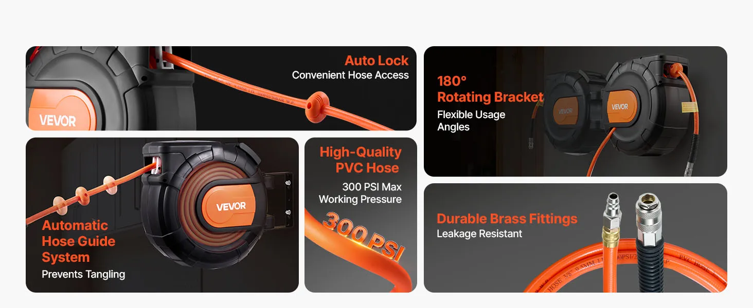 Riavvolgimento automatico: gestisci il tuo tubo facilmente con il sistema di riavvolgimento automatico: basta tirarlo delicatamente. Il fermo regolabile e il blocco del binario integrato consentono di fissare il tubo a qualsiasi lunghezza