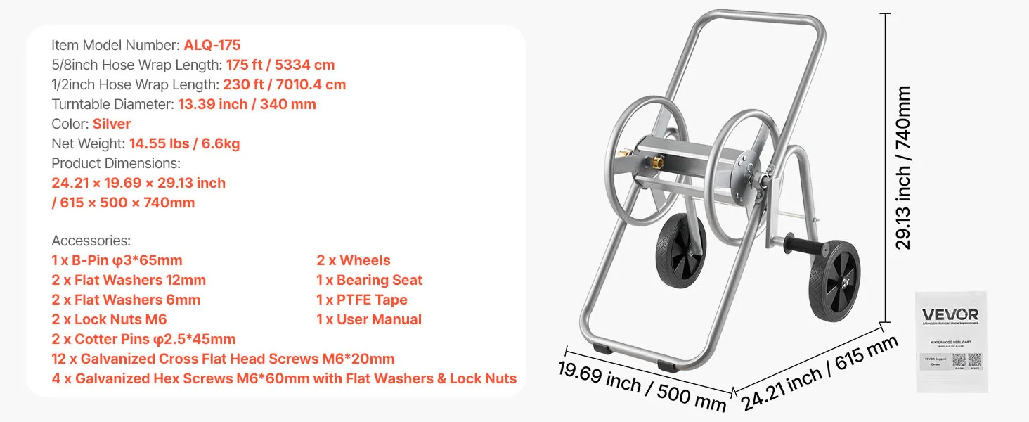 L'avvolgitubo mobile VEVOR con ruote ha un design intuitivo. È dotato di istruzioni facili da seguire. Le istruzioni ti guidano passo dopo passo nel processo di assemblaggio. Ciò rende semplice per chiunque montare il carrello. Inoltre, il design incorpora caratteristiche che ne migliorano l'usabilità. Le ruote in PVC solido facilitano lo spostamento del carrello. Puoi coprire ampie aree senza frequenti riposizionamenti. I collegamenti in ottone assicurano una tenuta sicura e prevengono le perdite. Il carrello è comodo da usare. Grande funzionalità senza competenze o strumenti speciali.