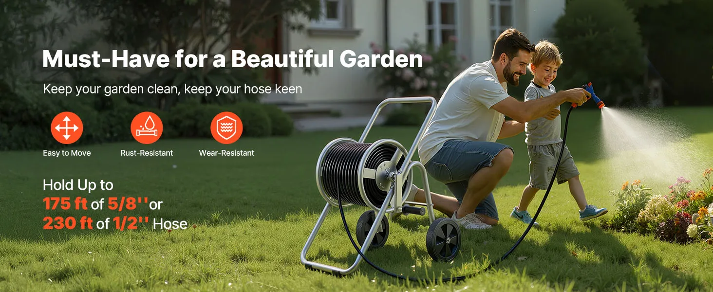 L'avvolgitubo per impieghi gravosi VEVOR è dotato di ruote in PVC solide. Queste ruote offrono maggiore stabilità e manovrabilità. Le ruote sono progettate per gestire vari terreni. Ciò semplifica lo spostamento del carrello nel tuo cortile o giardino. Inoltre, le ruote aiutano a distribuire il peso in modo uniforme. Garantiscono che il carrello rimanga stabile anche quando è completamente carico. Grazie a questa maggiore stabilità, è più facile avvolgere il tubo senza troppi sforzi. Inoltre, puoi goderti l'azione di rotolamento fluida. Ecco perché spostare la ruota da un posto all'altro diventa senza sforzo. La combinazione di ruote solide e costruzione robusta migliora l'usabilità del carrello. Ottieni una grande praticità per le attività all'aperto.