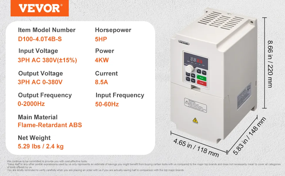VEVOR Azionamento a Frequenza Variabile VFD 5HP 4KW 8,5A Ingresso Trifase CA 380V Uscita Trifase CA 0-380V, Ingresso 50/60Hz, Uscita 0-2000Hz VFD per Controllo Velocità Motore Mandrino