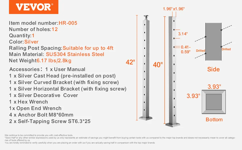 VEVOR Palo per Ringhiera per Scale, Palo per Parapetto Fori Inclinati a 30 Gradi, 12 Fori Preforati, Palo Ringhiera Acciaio Inox 106,7x5x5 cm, Argento, 1JZLGZ1067556VUN5V0