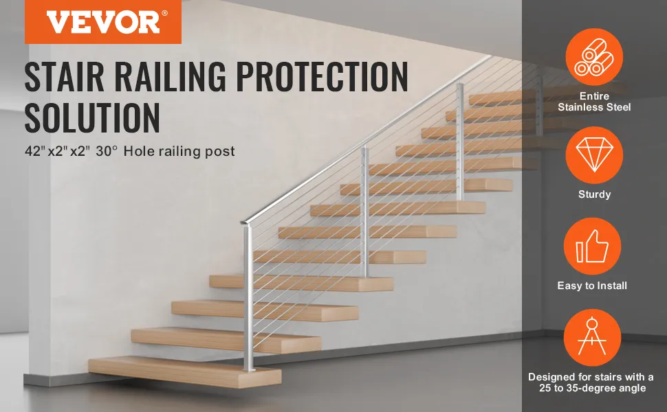 Il montante per ringhiera in cavo VEVOR è ideale per scale con angoli compresi tra 25° e 35°. Migliora la sicurezza sulle scale, garantendo protezione per tutti. Il foro angolato a 30° si adatta perfettamente alle pendenze delle scale. Ottieni un'opzione di ringhiera sicura e stabile. Questo design soddisfa gli standard di sicurezza. Previene le cadute e supporta funzioni di navigazione sicure. La sua altezza di 42 pollici aumenta le sue capacità protettive. È un'eccellente soluzione per scale residenziali e commerciali. Con questo prodotto, la sicurezza è garantita per tutti gli utenti.