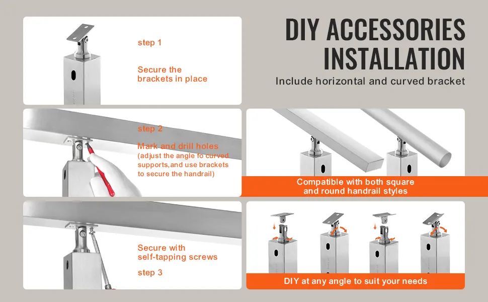 Il nostro montante per ringhiera per scale è dotato di fori preforati, eliminando la necessità di ulteriori forature durante l'installazione. Puoi regolare facilmente l'angolazione e la posizione durante l'installazione, aiutato dagli accessori inclusi.