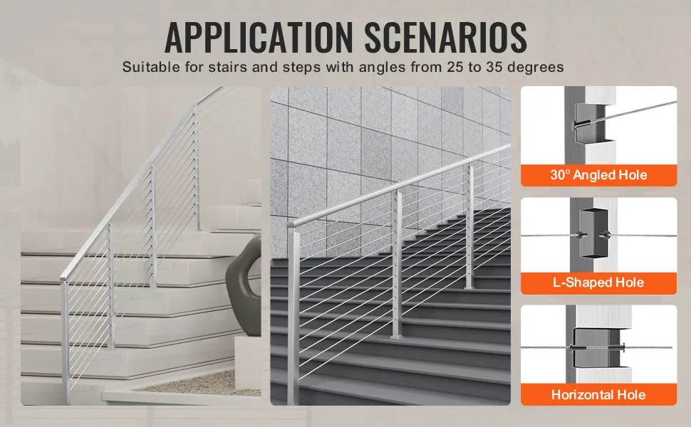 Questo palo per ringhiera in cavo è perfetto per scale con angoli specifici. Si adatta a scale con angoli tra 25° e 35°. Questo design mirato garantisce una protezione ottimale. Si allinea perfettamente con l'inclinazione della scala. Questo allineamento aumenta la sicurezza sulle scale, rendendolo una scelta affidabile. L'attenzione su angoli specifici rende questo prodotto adatto a vari design di pendenza. Puoi scoprire che offre un'opzione di ringhiera affidabile e stabile. Una delle caratteristiche più importanti per migliorare la sicurezza della tua scala è la sua capacità di fornire una protezione affidabile. Detto questo, il palo fornisce una sicurezza affidabile per tutti con design esteticamente gradevoli.