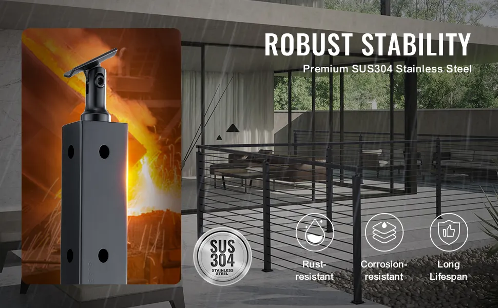 Questo palo per ringhiera a L in acciaio è realizzato in acciaio inossidabile SUS304 di alta qualità. Questo materiale offre un'eccellente resistenza alla ruggine e alla corrosione. Garantisce una lunga durata del prodotto. L'acciaio è resistente e affidabile. Nel tempo, non si usura. Questa durevolezza lo rende incredibilmente prezioso. Non dovrai sostituirlo spesso. Questo palo per ringhiera in cavo in acciaio inossidabile è ideale sia per applicazioni interne che esterne. Tuttavia, i progetti costieri non sono consigliati. Ciò è dovuto all'elevato contenuto di sale nell'aria. Tuttavia, nonostante ciò, resiste bene in altri ambienti ed è affidabile per un uso a lungo termine.
