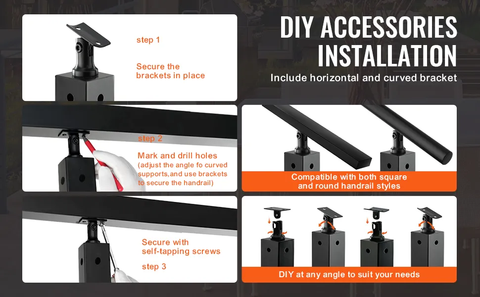 Questo palo include staffe orizzontali e curve. Queste staffe si adattano a vari tipi di fori nei pali delle ringhiere. Sono compatibili con stili di ringhiere quadrati e rotondi. Ciò lo rende adattabile a diverse configurazioni, così puoi personalizzare la vestibilità in base alle tue esigenze. È perfetto per coloro che desiderano flessibilità nel loro sistema di ringhiere. Sono facili da installare e garantiscono una vestibilità aderente. Questa caratteristica migliora la versatilità e l'usabilità del palo.