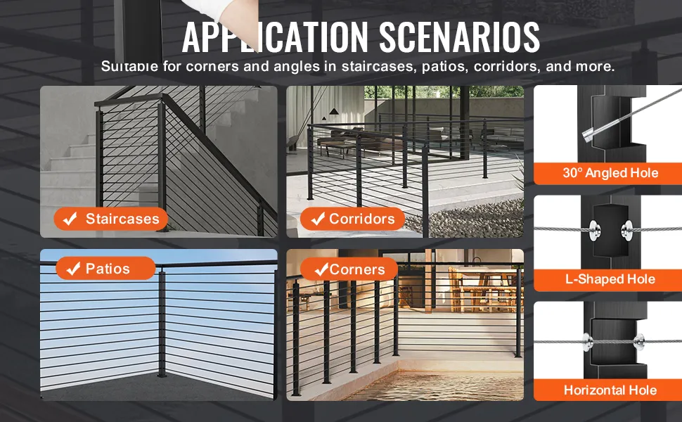 Questo palo per ringhiera in cavo è versatile. È perfetto sia per ambienti interni che esterni. Questo palo per ringhiera è ottimo per tutti i tipi di scopi. Puoi usarlo per angoli, scale, portici e altro ancora. È adatto per recinti, patii e balconi. Grazie alla sua struttura in acciaio inossidabile, dura in molte condizioni. Può essere utilizzato sia per applicazioni residenziali che commerciali. Ciò include hotel, garage e giardini. Grazie alla sua versatilità, sarà un'eccellente aggiunta a qualsiasi progetto. Puoi contare sulle sue prestazioni affidabili in qualsiasi ambiente.