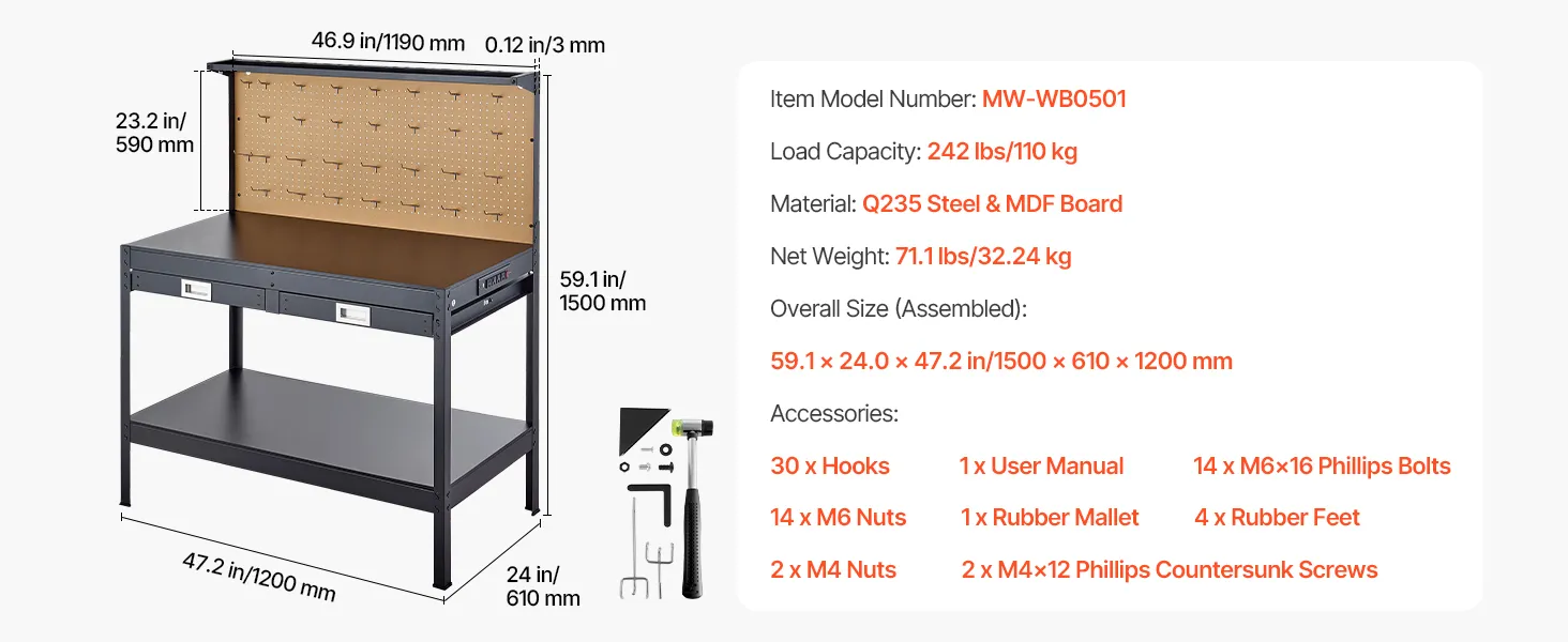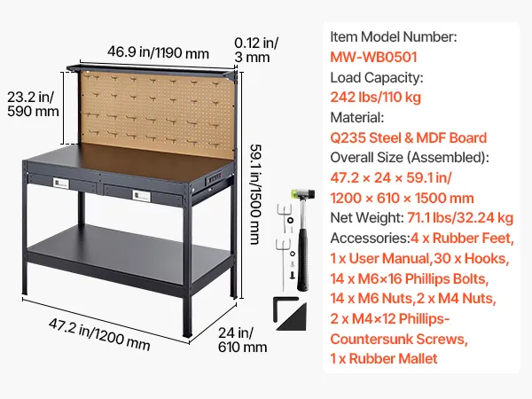 We include 30 hanging hooks and a perforated MDF pegboard, making the workbench easy to keep your tools neatly organized and within reach. Say goodbye to clutter and work more efficiently with everything in its place.