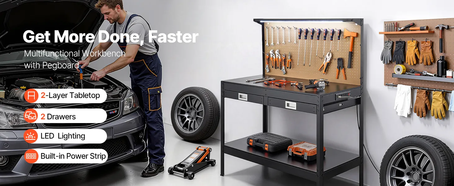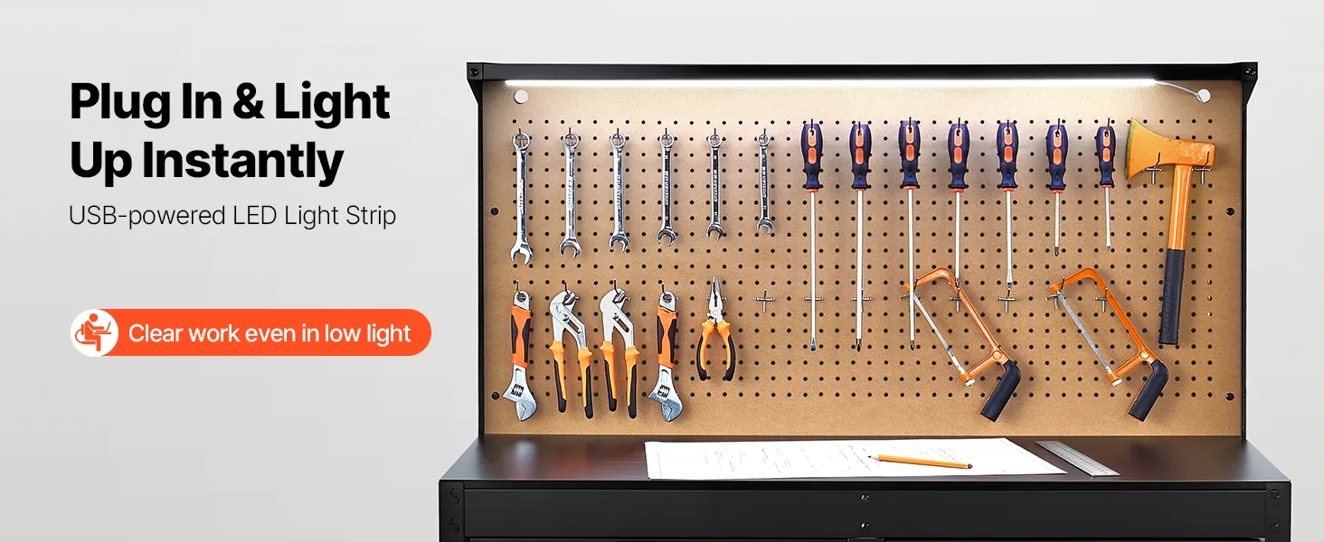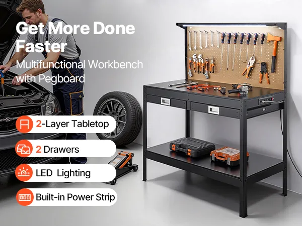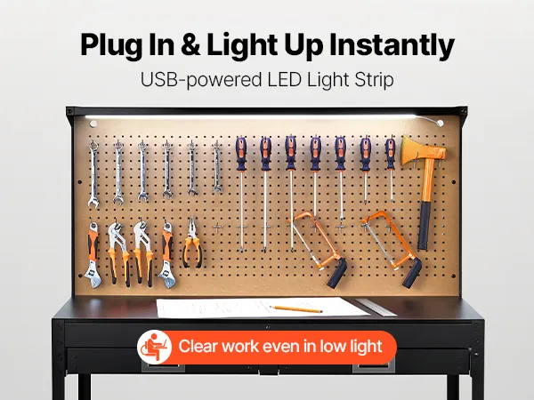 LED Lighting for Enhanced Visibility: Featuring a 8W LED light, this garage work bench enhances visibility, making it ideal for dim garages or basements. Enjoy energy-efficient lighting that helps you work with precision at any time