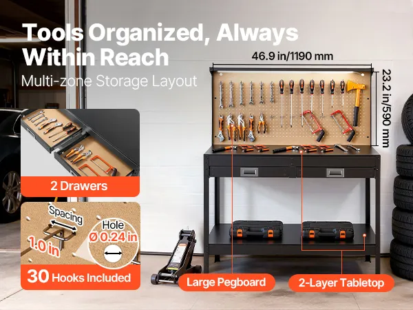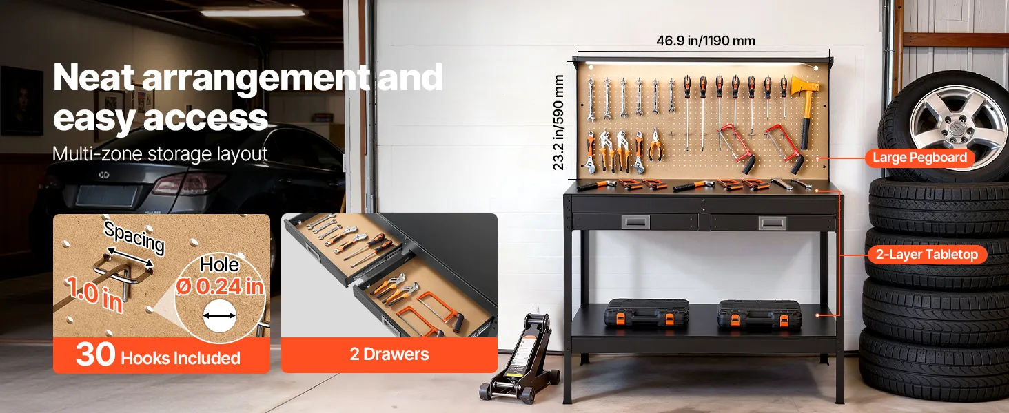 Efficient Storage Solutions: Keep your workspace tidy with 30 hanging hooks, a spacious pegboard, drawers, and a dual-layer design. This setup of the garage workbench ensures all your tools are organized and within reach, so you can work faster and more efficiently.