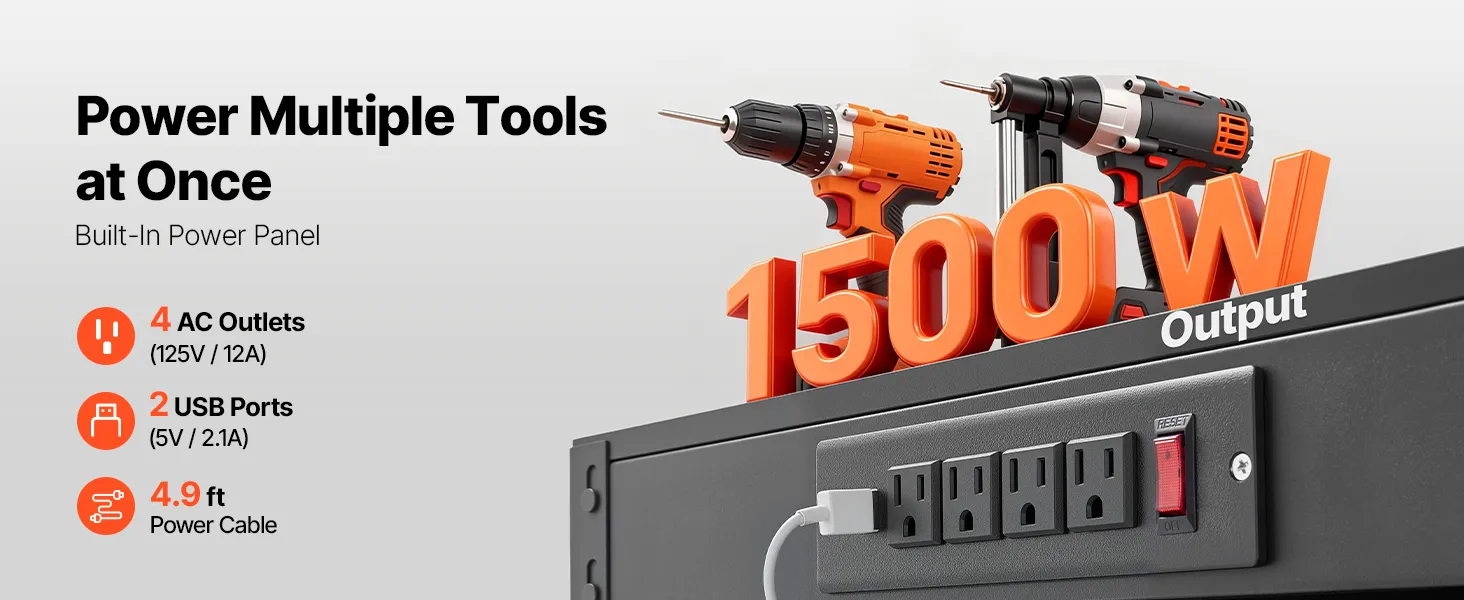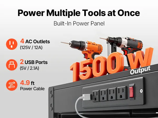 With a built-in power panel, you get four AC outlets and two USB ports, allowing you to power multiple tools at once. The 4.9 ft cable ensures you always have a reliable power source right at your fingertips.