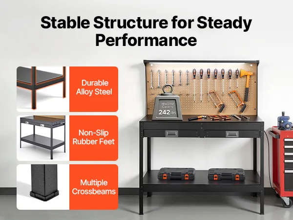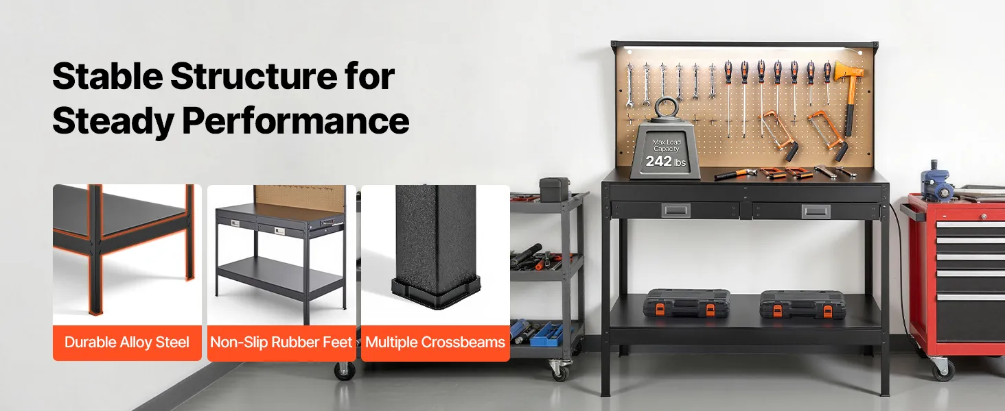 Impressive Load-Bearing Capacity: Designed with fixed rubber feet, this heavy duty workbench stays steady on uneven floors, providing grip and balance. It can handle up to 242.5 lbs, making it a reliable choice for heavy-duty projects