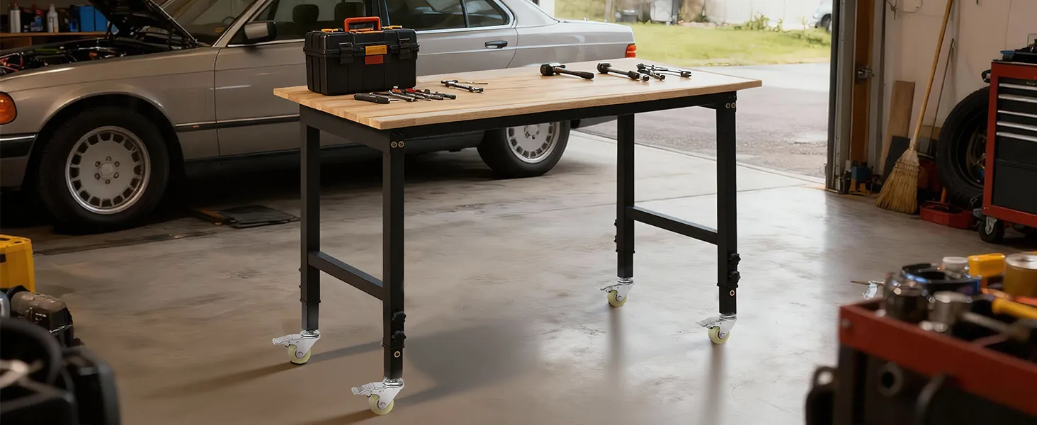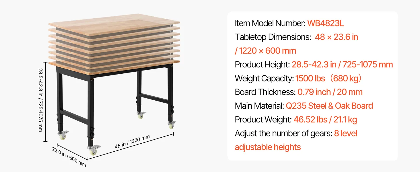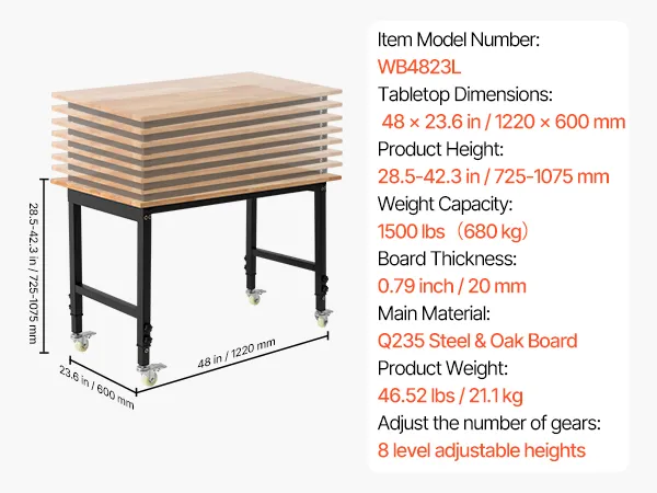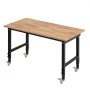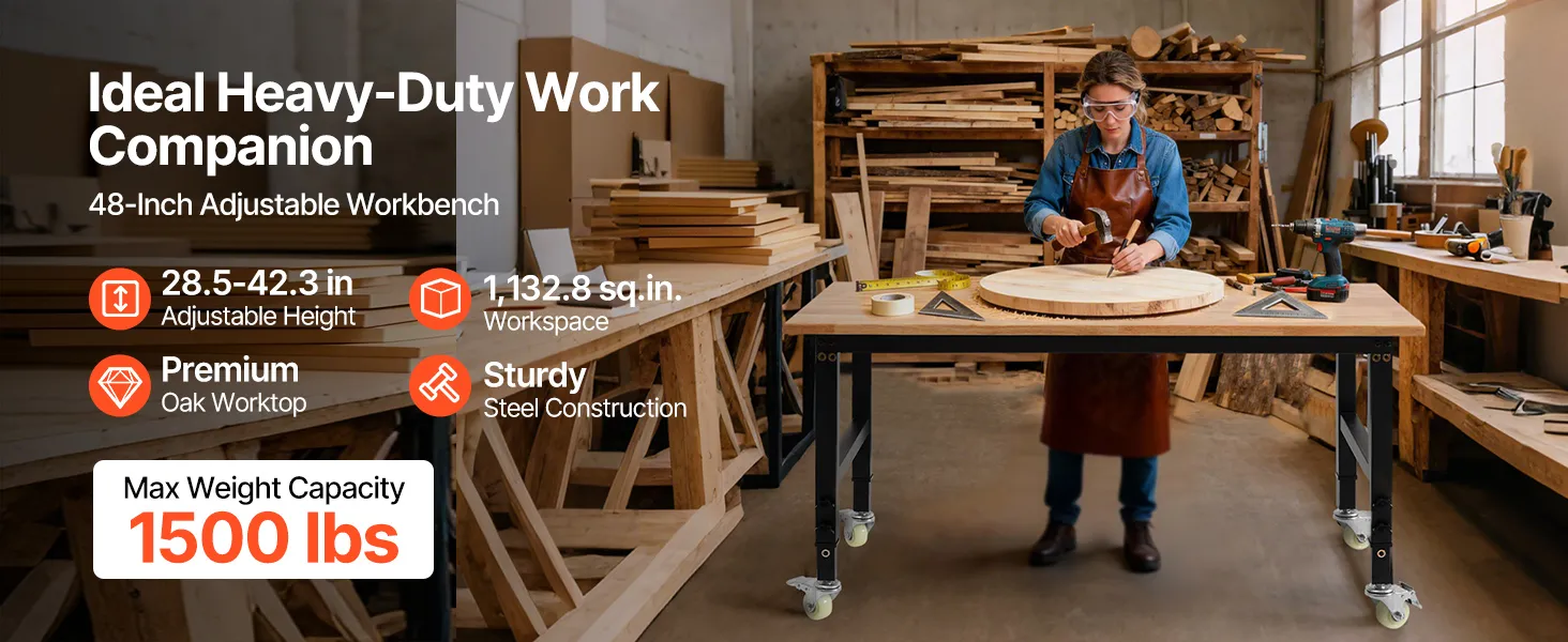 VEVOR Banco da Lavoro con Ruote Capacità 680 kg con Piano in Legno di Quercia da 122 x 60 cm con Regolazione dell'Altezza da 72,5 a 107,5 cm, Tavolo da Lavoro in Legno Massello Resistente per Garage
