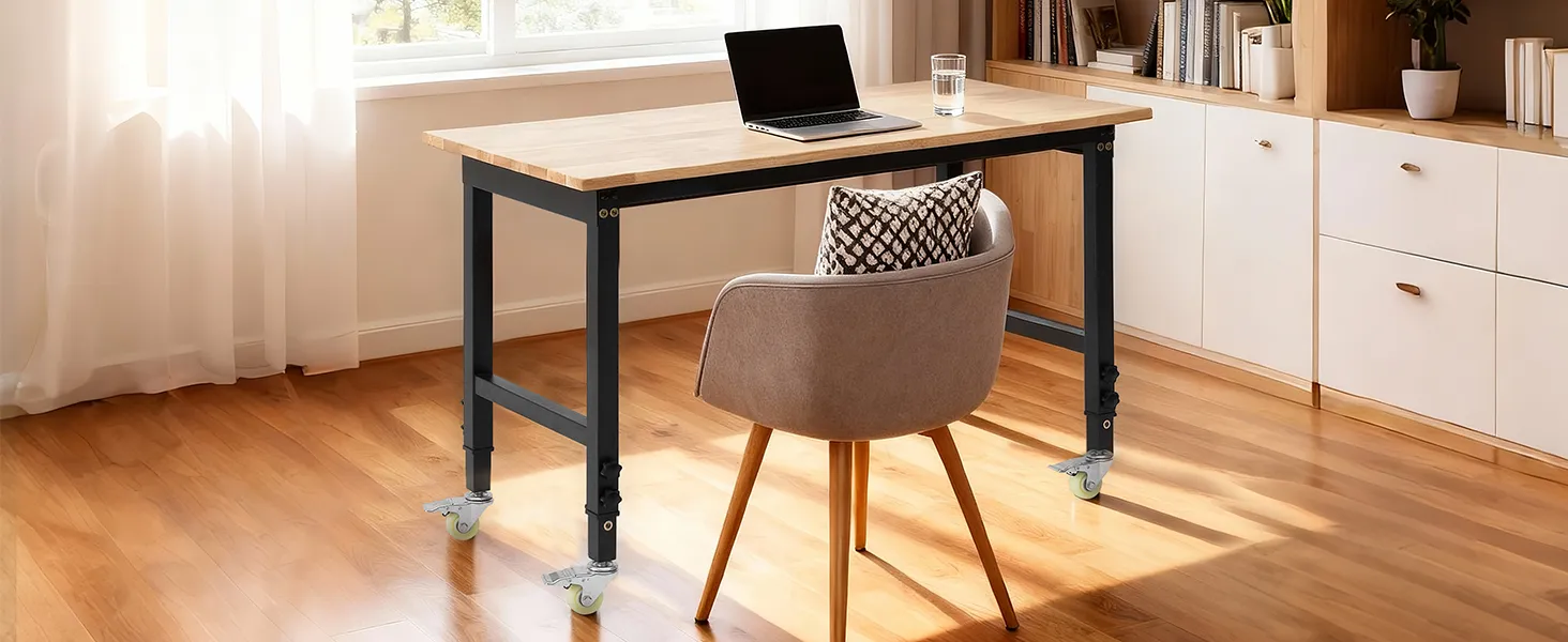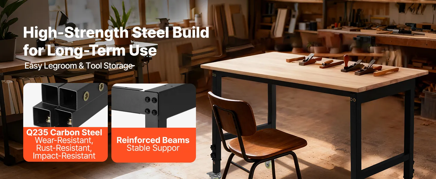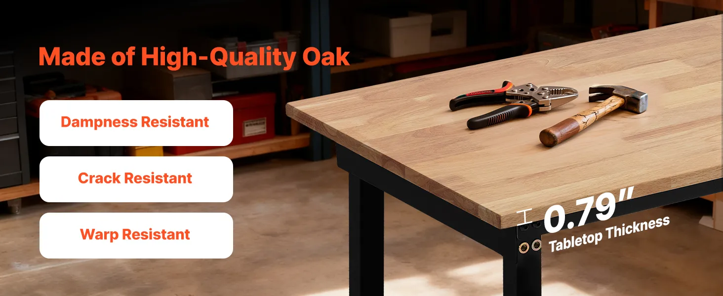 Regolazione dell'altezza in 8 posizioni: questo banco da lavoro con piano in legno di quercia può essere regolato da 67 a 102 cm semplicemente spostando i bulloni delle gambe. È possibile regolare l'altezza in base alle proprie esigenze