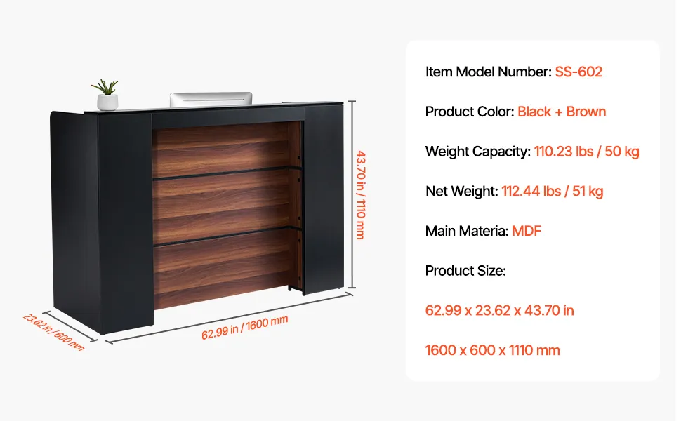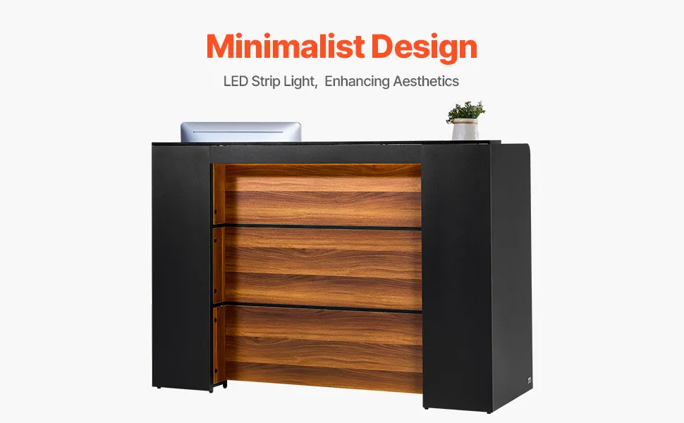 VEVOR Banco Reception 1600 x 600 x 1110 mm Tavolo da Banco Rettangolare, Tavolo di Vendita per Ufficio con Luce a LED, per Registratori di Cassa, Hall, Saloni di Bellezza e Uffici, Nero e Marrone